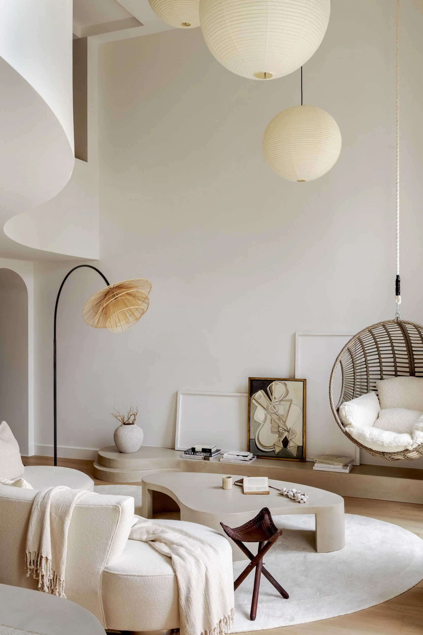 This meditative London apartment, designed by Olga Ashby, blends sophistication and simplicity through its fluid, curvy design and earthy, neutral palette. Originally a plain open-plan cube, it was transformed into a serene inner-city sanctuary using natural materials like wood, linen, and micro-cement. Curves and arches throughout the space create a calming, harmonious atmosphere, with features like circular mirrors and bespoke furniture enhancing the flow. Every detail, from vintage artefacts to sustainably sourced décor, contributes to a space that feels like a peaceful refuge in the city's heart.